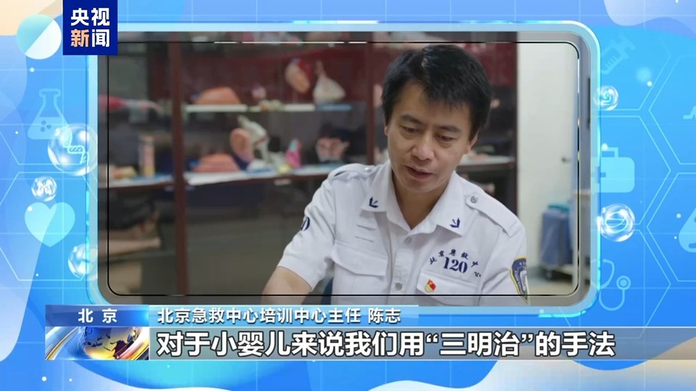 北京急救中心培训中心主任 陈志:对于小婴儿来说我们用“三明治”的手法,把婴儿抱起来,把他头冲下,用大鱼际拍击他的两个肩胛中间位置,一秒一次快速拍击,一共拍5次,翻过来以后,再用两个手指在两连线次冲击式按压,一秒一次,反复操作,直到异物冲出为止。